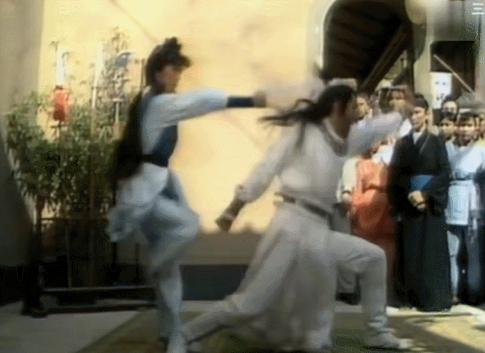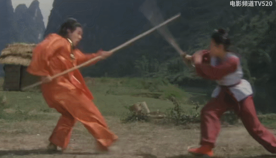 在新版《倚天屠龙记》,周芷若这段与别人的打戏。回身一剑,跪地一剑,一人一个慢动作,公平。