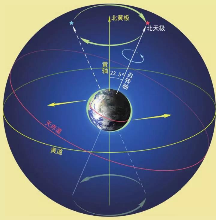 玩过陀螺的人都知道,当陀螺逐渐慢下来的时候,它的旋转轴会绕着与地面垂直的轴线旋转摇晃。地球在公转和自转的同时,还有一种像陀螺似的摇头晃脑的缓慢运动。由于地球并不是一个理想的球体,赤道处稍稍隆起,太阳、月亮等天体对隆起部分的附加引力,使得地球自转轴的空间指向并不固定,而是绕着黄轴(通过地心并与地球绕太阳公转的轨道平面垂直的轴线)做缓慢的圆周运动,运动方向与地球自转方向相反,约26000年旋转一周,这种现象称为岁差。