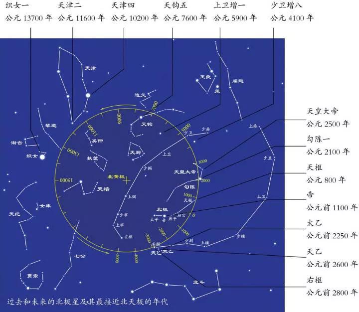 明白了岁差的原理,再顺着北天极行移的路径寻找,我们会发现一串霸气的星名。它们都曾经是不同时代的北极星。紫微右垣的右枢星旁有两颗暗星,一颗叫作“天乙”,也称“天一”;另一颗为“太乙”,也叫“太一”。这些名字无不显示着吞吐乾坤的气势,它们在4000多年前最接近北天极,被殷商人奉为北极星。帝星从周代起,成为距离北极最近的亮星,因此担当起了西周至两汉时期北极星的重任,最高天神“太一”也迁居于此。由于中国星官体系在汉代基本定型,因此它也就顺理成章取得了“帝”的称号。汉以后北天极与帝星渐行渐远,逐步向一颗不起眼的小星靠近,于是这颗司马迁时代的无名小星成为了天之枢纽,被称为“天枢”或“纽星”,并由四星环绕,名曰四辅抱极。宋代以降纽星又逐渐退出了星空枢纽的位置;元明起,勾陈一成为新的北极星,公元2100年左右,北天极离勾陈一最近,之后逐渐远离,向另一颗小星“天皇大帝”靠近。星占书中说,天皇大帝的神名叫耀魄宝,主宰着宇宙生灵,掌管着万神图。但使人疑惑的是,这颗极其暗弱的小星在尚未成为北极星之前就被赋予了无比尊贵的名字。难道是古人洞悉了岁差的规律,提前给它正了名分,以免怠慢了千年以后的大神?这种可能性很小。一些天文史学家认为,天皇大帝的名字可能是古人对北极天枢的称呼,但被后世的星占家张冠李戴了,不想反而歪打正着,成了有预见性的名字。
