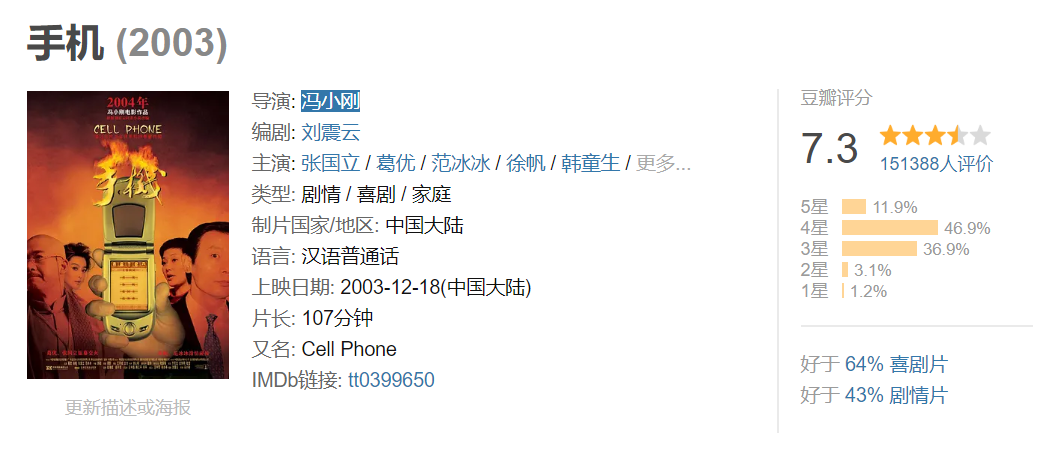 2、《手机》:国产电影,豆瓣评分7.3,导演冯小刚