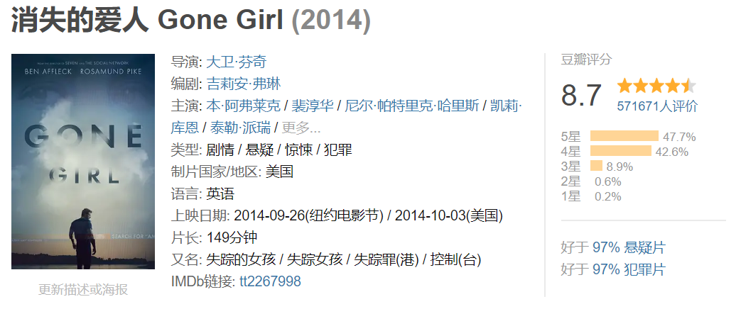 6、《消失的爱人》:美国电影,豆瓣评分8.7