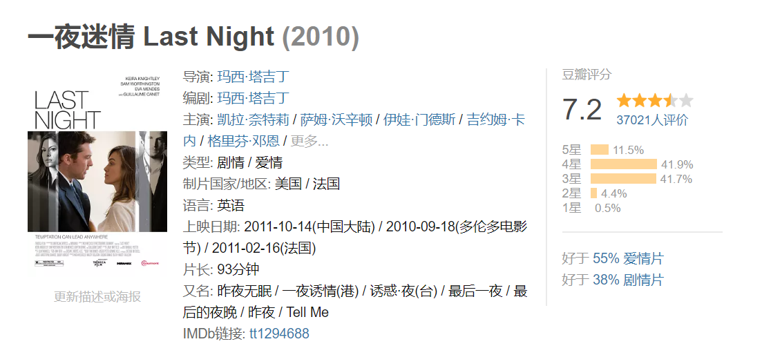 3、《一夜迷情》:法国电影,豆瓣评分7.2