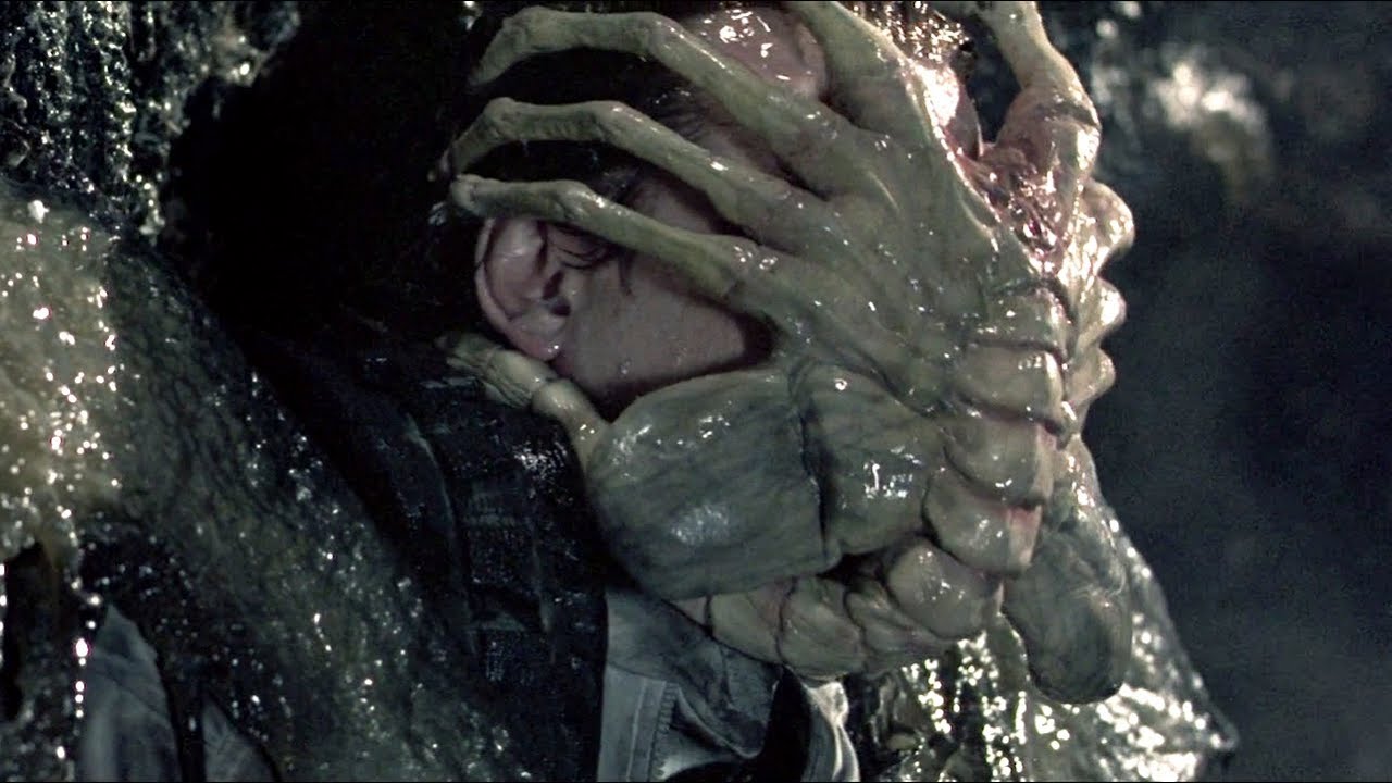 “抱脸虫”可以看作异形生命周期的第一站,它没有眼睛,通过辨别周围的气压和磁场变化来判断猎物的位置,它存在的目的只有一个,就是想方设法把遗传物质注入宿主体内。