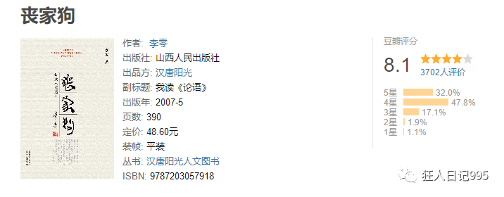 这个作者我去年推荐过他的《去圣乃得真孔子:论语纵横读》。当时是因为网上找不到《丧家狗》,所以退而求其次。今年得偿所愿,总算在二手书网站买到了。