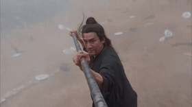 作为动作指导出身的导演,陈会毅在角色选择、动作风格、影片整体把握各方面都体现出了强大的整合能力。角色后头再述,光说动作风格既出人意料但又情理之中。长期在洪家班硬桥硬马、见招拆招偏写实风格中浸淫的陈会毅,居然在各个打斗场景都充分运用了“威亚”技术,可能也受限于主演梁家辉、徐锦江等人均不是武行出身,片中各种飞天遁地、爆炸四射基本是当年香港二流动作片的标配,但陈会毅还是在这烂俗动作中玩出了点新创意,鲁智深的“流氓神拳”和虎虎生风的150斤(小说原著中只有67斤)月牙铲都让人感叹鲁达再世,而林冲一杆长枪更是耍得矫若惊龙,阅片经验告诉我除了李连杰在《新少林五祖》中的洪熙官之外没有谁舞枪能比该片中的林冲更帅,当然影片中公认的动作名场面当然是林冲与陆谦最后对决时使出的一招同归于尽,林冲直接弃防让陆谦拿长枪捅了个透心凉而觅得反击的机会,那股决绝实属罕见,后来央视拍摄《水浒传》动作导演袁和平袁八爷直接copy了这一动作场面,只不过角色换成了陆谦。