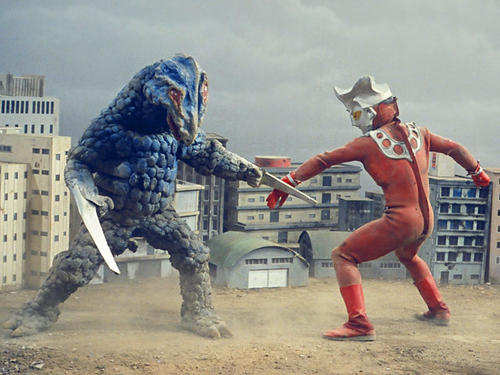 还有的剧集谈不上恐怖,但是直教人犯恶心,比如说艾斯的《河童宅邸之谜》,能看到昭和时期的所谓“义体机器改造人”,亚波人将孩子的身体与生物机器改造到了一起;还有雷欧的第三集,一位父亲和一位防卫队员,被祖鲁克星人当街砍成两半,摄影师还给被截成两半的尸体来了段特写,可以说是相当恶趣味。