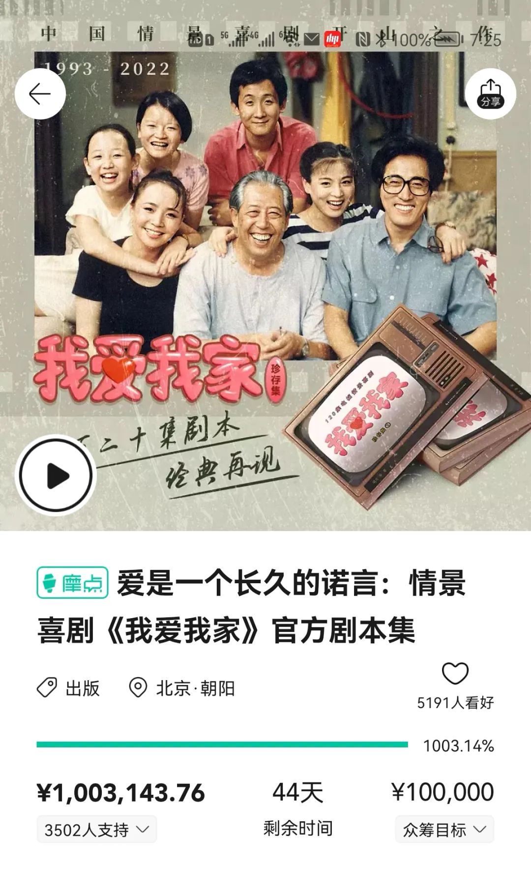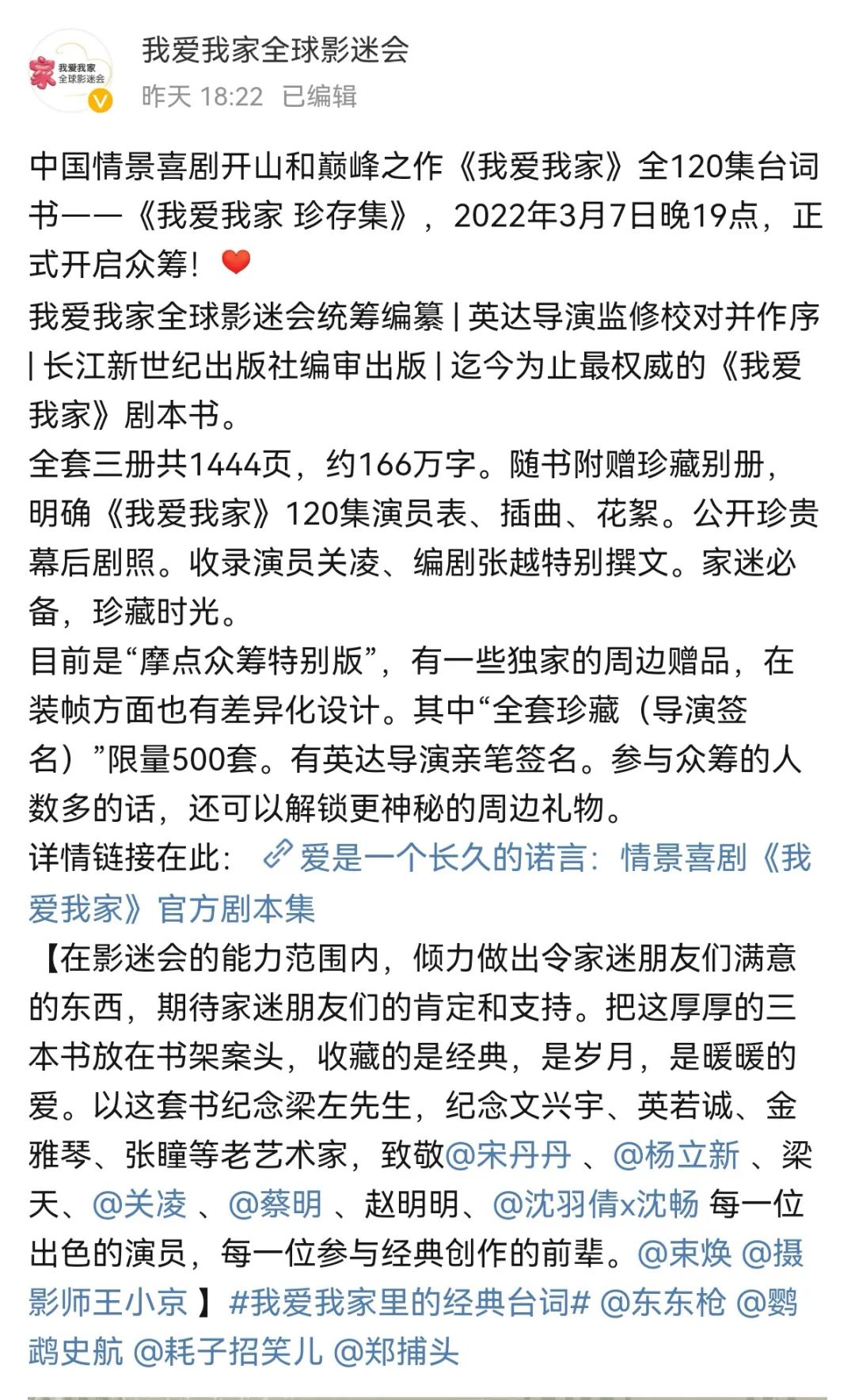3月7日晚,“我爱我家全球影迷会”通过微博发布了一条消息:“中国情景喜剧开山和巅峰之作《我爱我家》全120集台词书——《我爱我家 珍存集》,2022年3月7日晚19点,正式开启众筹!”