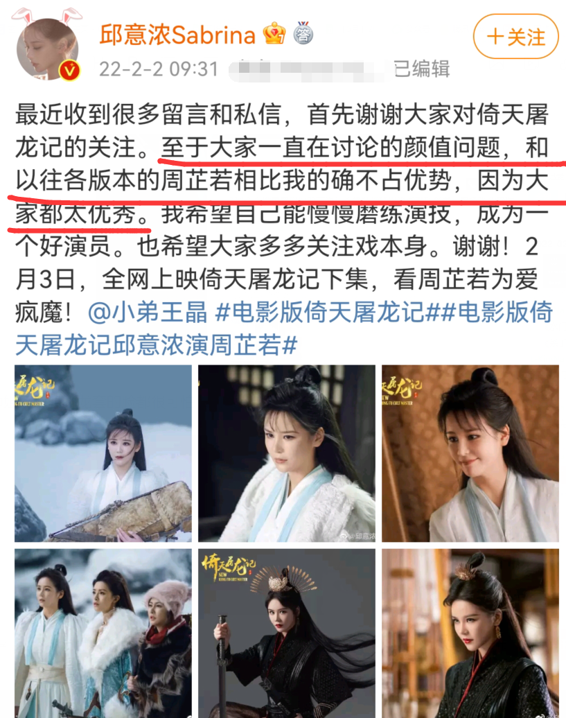 新版《倚天》上线后,针对邱意浓颜值的争议很大,对此她也发博回应,称和以往每版周芷若比起来,她确实不占优势,因为她们都太优秀了,希望大家可以多多关注作品本身。