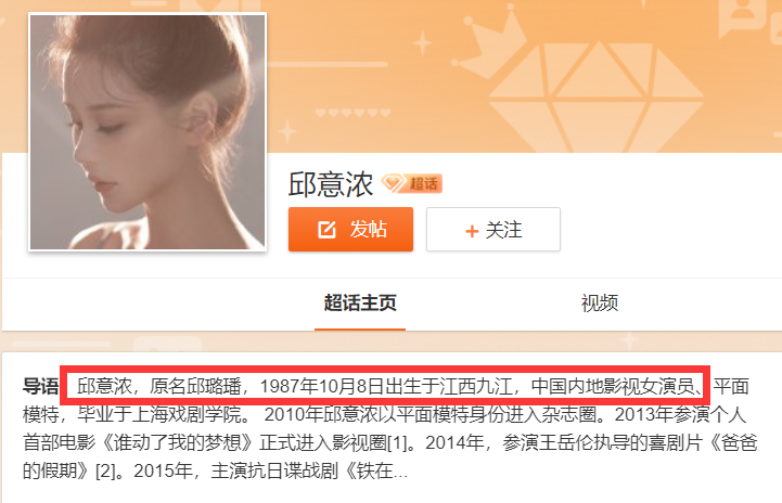 虽然邱意浓现在的资料上都写着她是90后,但其实她是87年的,比文咏珊还大了一岁,她超话上的信息现在还没改过来,也暴露了她的真实年龄,她把自己改小了三岁,直接从85后变成了90后。