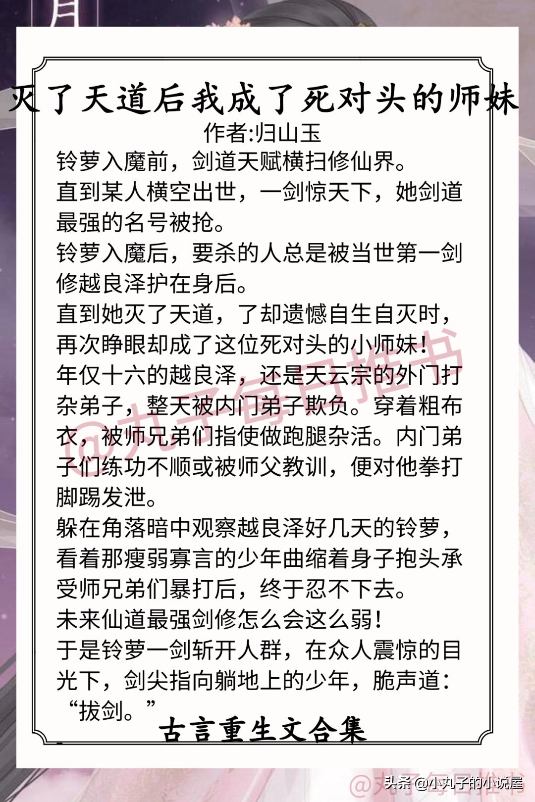8.《灭了天道后我成了死对头的师妹》 作者:归山玉(又飒又美小师妹vs悲惨冷漠小可怜,女主重生,治愈救赎,仙侠修真爽文)
