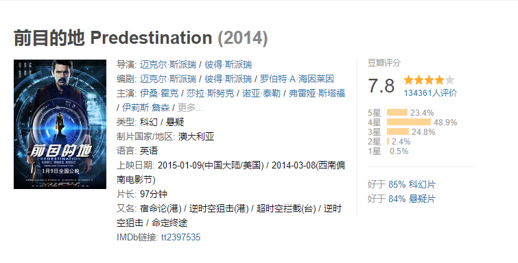 《前目的地》是一部科幻悬疑电影,但同时也是一部富有哲理的影片。影片改编自美国现代科幻小说之父罗伯特·安森·海因莱茵的小说《你们这些还魂尸》,该作品也被称为时空穿越类小说的鼻祖,是多部时空穿越题材影片灵感来源。由迈克尔·斯派瑞、彼得·斯派瑞联袂执导。获得了第17届上海国际电影节金爵奖-最佳影片的奖项提名。