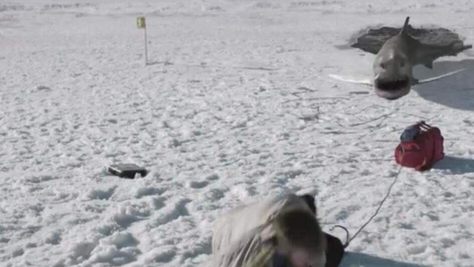 附近的考察队知道了这件事情,就去调查猎人被杀的原因。主人公金发妹和她男友大卫就骑着电动雪上小摩托出去探查情况,另一方面队友短发连面胡子男去调查信号站的问题。金发妹和男友大卫刚到冰川旁边,就被鲨鱼蹲了一波,差点去领盒饭,大卫被鲨鱼一尾巴给摔进了海里。