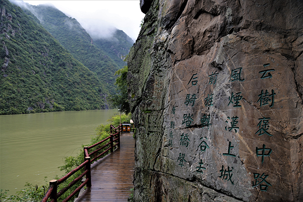 天上飘着小雨,雾气升腾中的秦岭额外的迷人。因为水库大坝的缘故,河水更加的湍急,轰隆隆的声响仿佛就像一群奔腾的战马发出的声音。从石门景区的大门开始有一段足足2公里长的商业街,让我这个急迫想看到古道的游客额外焦躁,只能加快脚步忽略掉那些嘈杂的叫卖声。古道的开端设在水库大坝上边,爬上这几十米高的坝体也确实需要点体力。到了坝顶的那一刻,看着眼前壮阔的河面和两岸伸入云层的高山,望着身后消失在汉中平原上的褒河,开始的焦躁和登山的疲惫全都没了。