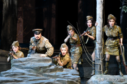 另外一条线索是对于“黎明”的贯穿,“这里的黎明静悄悄”,我认为从始至终一定要贯穿出“黎明”的线索。歌剧中,一个清晨,在激烈的战斗结束后,女兵丽莎第一声唱出了“多么美啊,黎明”,确实,自然界赋予我们生活当中的每一个黎明都是那么美好,但是由于有了战争,使它有时却变得可怕;女兵索妮娅是一个充满浪漫情怀的大学生,她对黎明的呼唤是“真爱在心中”,她也特别珍惜每一次黎明的到来;女兵丽达是位母亲,她为了保卫祖国离开家,把一个还很小的孩子留在家中,每天只能趁着深夜偷偷跑回家中看望,她在路上看着即将发白的天色,感慨她呼唤的黎明就要来了,这是对于美好胜利、对于和平到来的一种深情的呼唤,也是一位母亲发自内心迫切的期待。