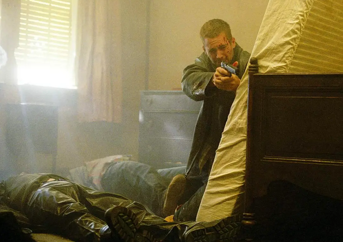 在黑吃黑枪战袭击后,回家的保罗·沃克,立即跟维拉·法梅加有亲密戏,迎合了香艳。曾经编剧《八面埋伏》的韦恩·克雷默导演对叙事与悬疑把握绝佳,就像男主角刚想过风平浪静的生活,突然隔壁子弹射穿玻璃袭来的长镜头,顿时张力十足。