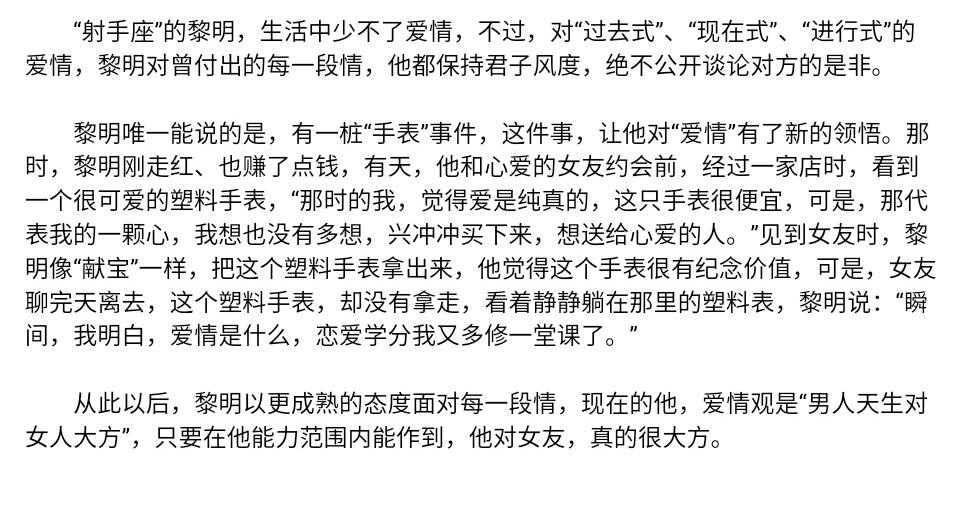 黎明还透露自己太忙了,忙得没有时间关怀女友,更怕自己名气太大,让恋情被闪光灯闪吹。