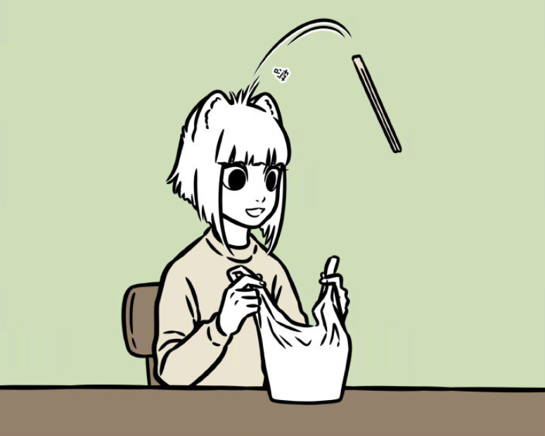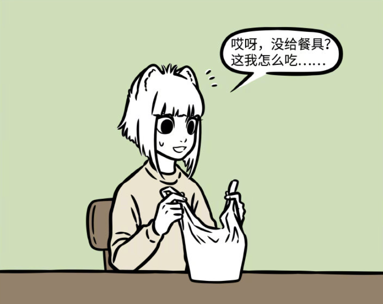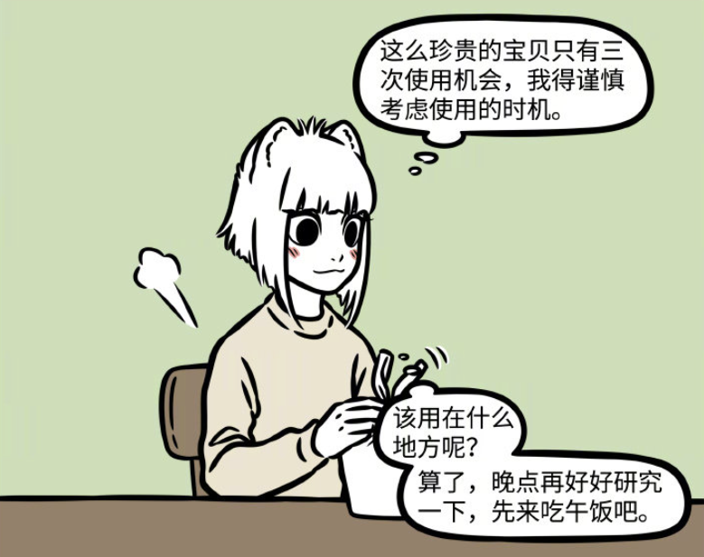 结果九月妹子一个不小心,买了午饭没给餐具,就光那么一想,大士给的毫毛就果断起作用了,给了她一双筷子。按照《非人哉》一贯的剧情安排,我怀疑后续那两根救命毫毛可能也会因为一些搞笑的理由被用掉。