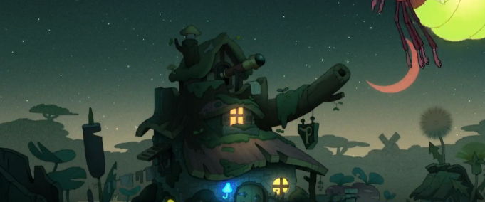 " 少女安与朋友打开了一个老旧音乐盒,转眼间来到这片陌生的世界,这片奇幻森林,这里的居民是五颜六色的青蛙,他们像人一般生活,到处是巨大的蘑菇,可怕的怪物,青蛙人将安这个外来者当成怪物,就像我们把会说话的青蛙当成怪物一般,在这个时候青蛙人盆盆和安不打不相识,很快相知甚至到惺惺相惜,盆盆和爷爷收留了安。