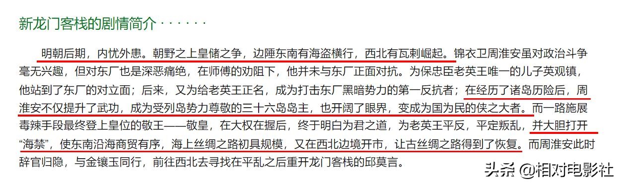 从目前所能查到的全新翻拍版《新龙门客栈》剧情简介,可以看出,新版除了故事背景,设定于明朝后期之外,又擅自加入了许多“海岛冒险”元素。并且,对于原片中最为重要的大漠场景,反而着墨不多。