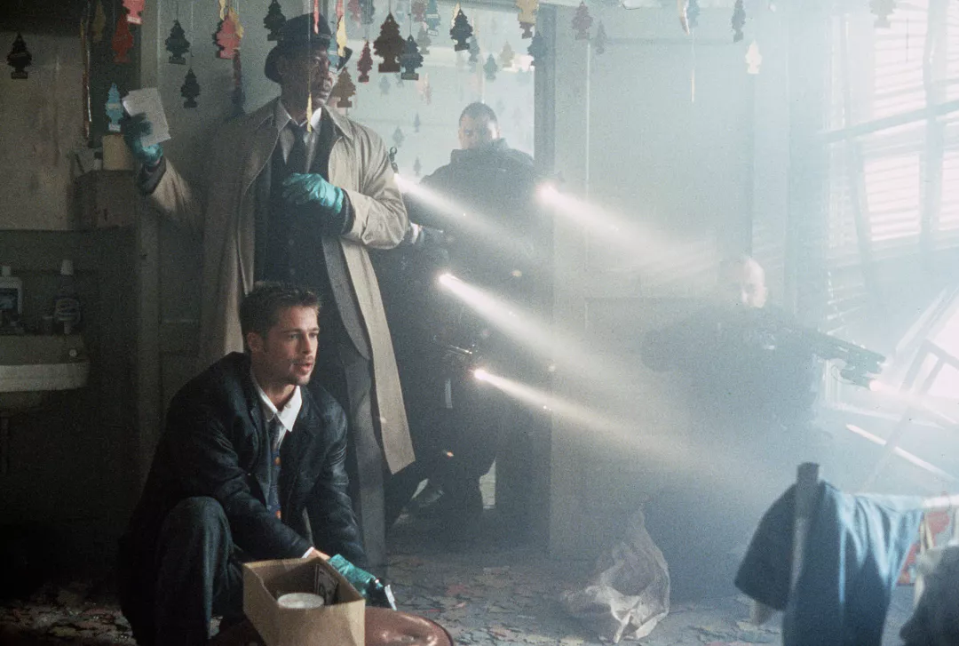 黑色照明和黑白有关,但是在电影《七宗罪》中,达吕斯·康第以创造性的方式提高了低调照明的使用(那些手电筒!)并且通过图像捕捉黑暗的氛围,而这正是大卫·芬奇在视觉和主题上都最为黑暗的电影。
