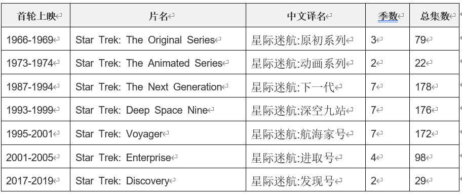 下面这张表罗列的,是《星际迷航》目前所有的剧集。下面我们就着这张表来一一说起。