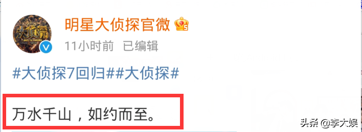 在节目组官宣《大侦探》回归时,除了一张宣传海报外,还配上了“万水千山,如约而至”8个字,其中“万水千山”4个字是撒贝宁在《明侦》演唱会看到魏晨和王鸥隔空合体时有感而发,当时他一句追忆不仅引得何炅、白敬亭等老玩家感叹,也引得节目粉泪奔,那种互相扶持、互相陪伴的心情不言而喻。