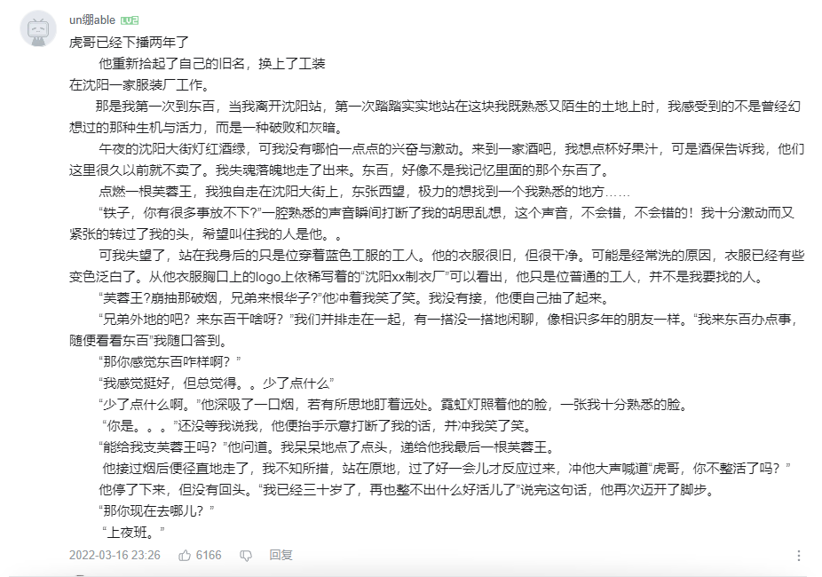 在《因为你我会记住那一分钟》的评论区,在每一个类似视频的评论区,涌现出了无数借题发挥的“文豪”,他们用优美的文字和感伤的预言叙述着属于虎哥又不属于虎哥的故事。人们把这段野蛮的时光搅烂、嚼碎,铸造成了一面既混沌又清晰的镜子。他们试图在自己为东百往事赋予的意义上看到自己,然后擅自与脑海中的意象共情。