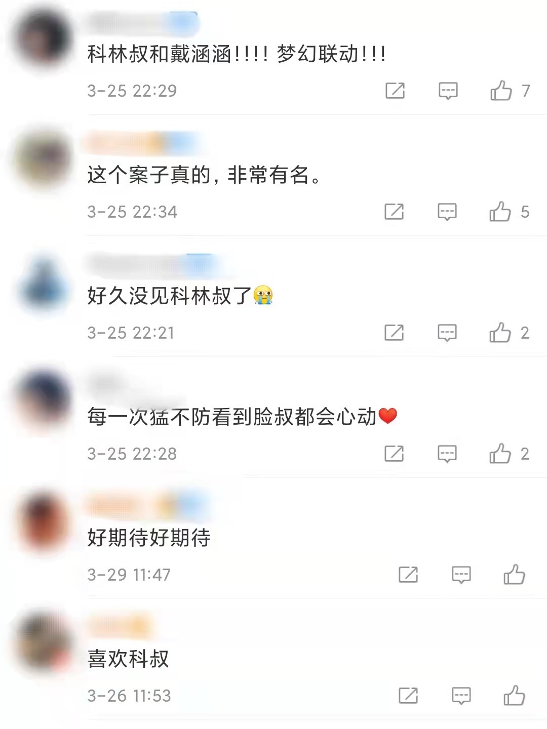 不少网友在看过预告以及之前发布的剧照之后,纷纷在社交平台上评论表示:“科林叔和戴涵涵梦幻联动!”“这个案子非常有名”“好久没见科林叔”……