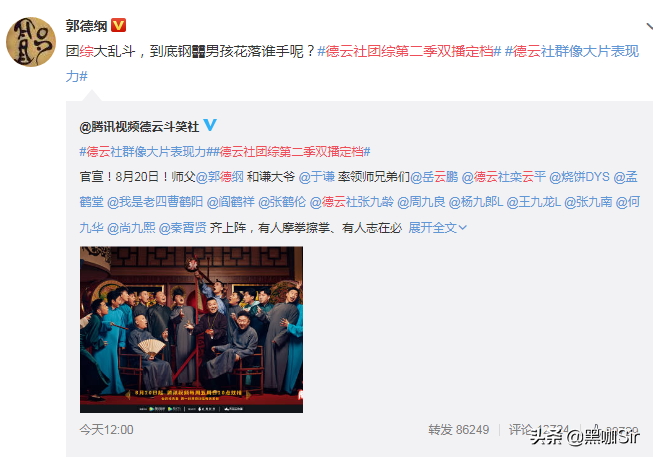 综艺节目即将开播。德云社班主郭德纲发文“团综大乱斗。到底钢?男孩花落谁手呢?”,所配的图就是一张参演人员的群像。其实,这张图片还看不出什么,毕竟都是所有演员在一起的剧照。除了郭德纲、于谦之外,居中站立的仍然是德云社的大红人栾云平、岳云鹏。当然,细心地网友应该看到了一些现象,那就是上一季力捧的秦霄贤似乎被边缘化了。
