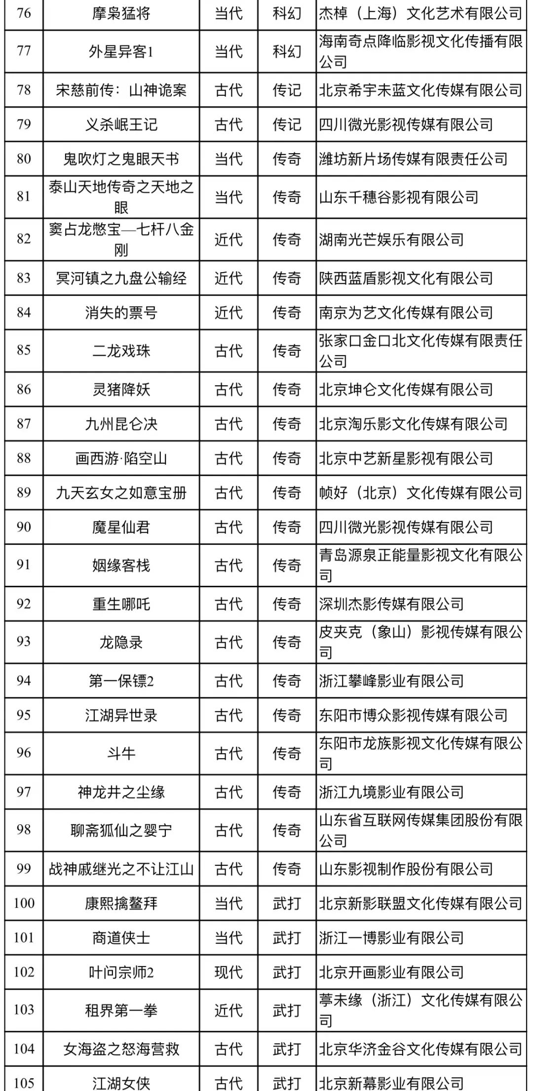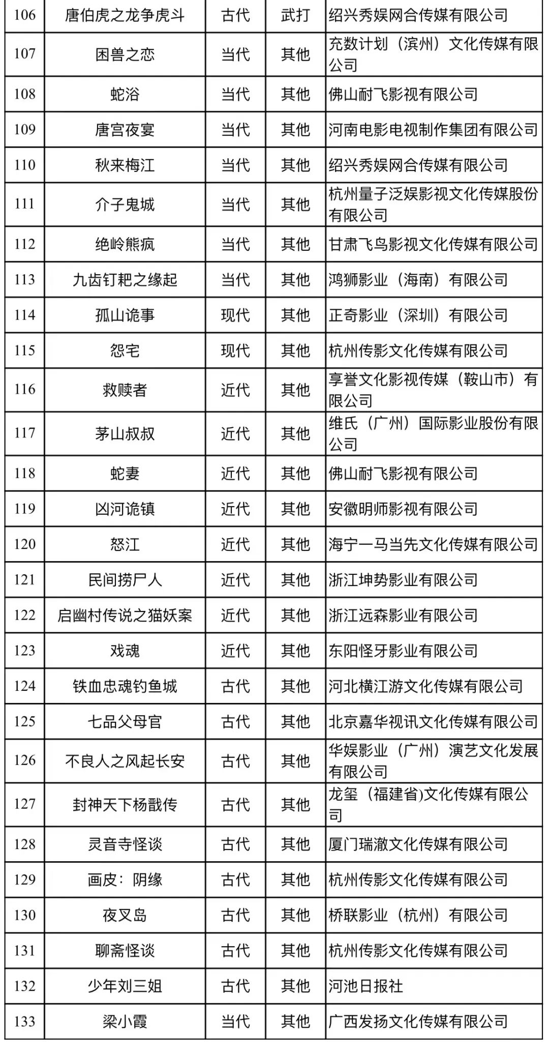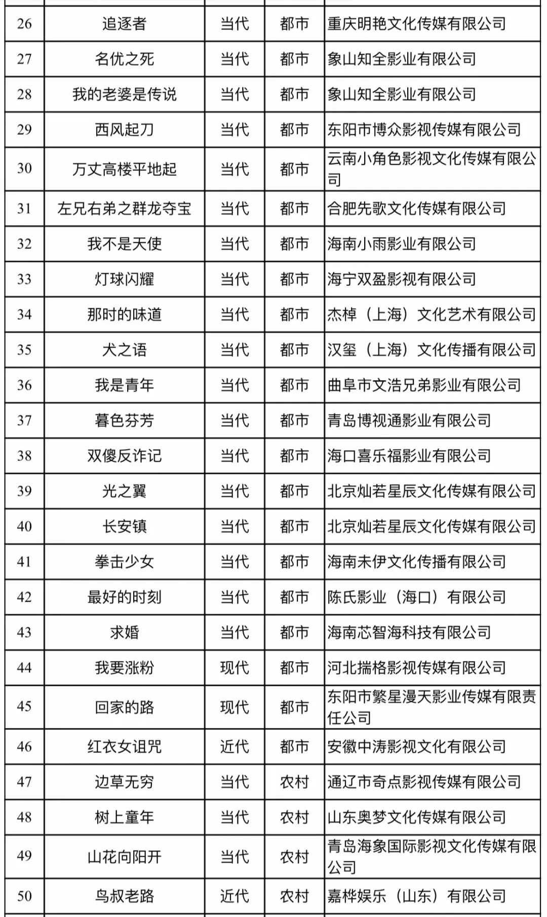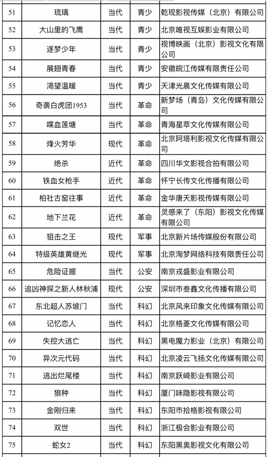都市题材:北京博衍传媒《街头霸王》、海南未伊文化《拳击少女》;农村题材:通辽奇点影视《边草无穷》、山东奥梦传媒《树上童年》;青少题材:北京乾现影视《琉璃》、北京视博映画《逐梦少年》;革命题材:青岛新梦场《奇袭白虎团1953》、怀宁长传《铁血女枪手》;公安题材:南京戎盛影业《危险证据》、深圳叁鑫文化《追凶神探之新人林秋浦》;科幻题材:北京凌云飞扬传媒《异次元代码》、海南奇点降临影视《外星异客1》;传奇题材:北京帧好传媒《九天玄女之如意宝册》、深圳杰影传媒《重生哪吒》;武打题材:北京新影联盟传媒《康熙擒鳌拜》、北京华济金谷传媒《女海盗之怒海营救》;其他题材:河南电影电视制作集团《唐宫夜宴》、浙江坤势影业《民间捞尸人》等。