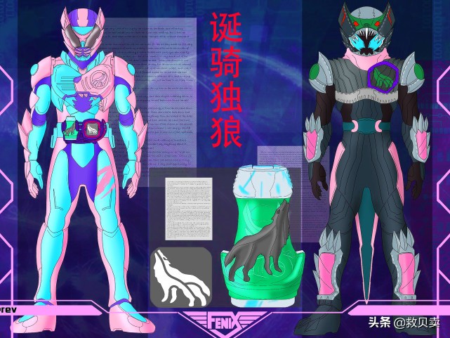 ?响鬼独狼:假面骑士响鬼与狼的结合造型,原型素材应该是装甲响鬼,头盔上的花纹和假面组成狼头模样,上身护甲整体造型不变,双肩护甲添加狼毛造型的尖刺,武器延续了音击棒·烈火的造型。维斯的造型也不再狰狞,头盔是长角的狼头形象,双肩盔甲是音击鼓造型,致敬感十足,可惜看不到机械形态的模样。