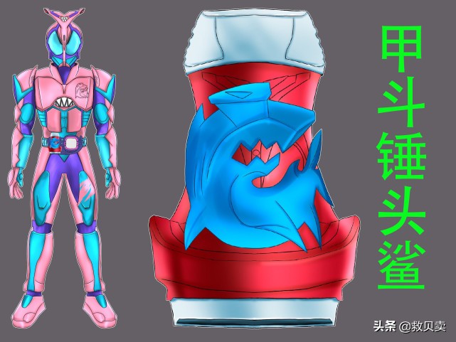 ?甲斗锤头鲨:假面骑士甲斗与锤头鲨的融合形态,甲斗基础形态不变,只是换了一个颜色,头上大角和胸前盔甲都变成了锤头鲨造型,乍一看还觉得有些好玩,在不破坏骑士形象的基础上融合动物元素不是每个人都能办到的。