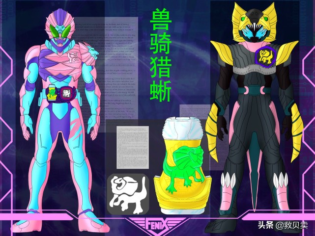 ?兽骑鬣蜥:使用鬣蜥印章变身,原型素体是假面骑士兽骑,兽骑本身就有变色龙形态,所以和鬣蜥结合后的形象没有丝毫的违和感,就是粉色的涂装不是很搭配,造型有点太简单了。相比一辉,维斯的鬣蜥形态更好玩,金色的鬣蜥头盔,能看到锋利的尖牙,还有双臂上的金色骨刺。