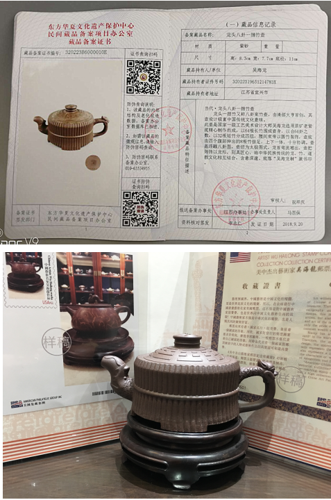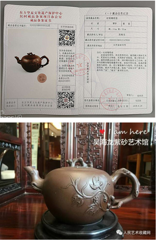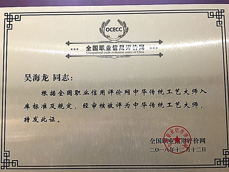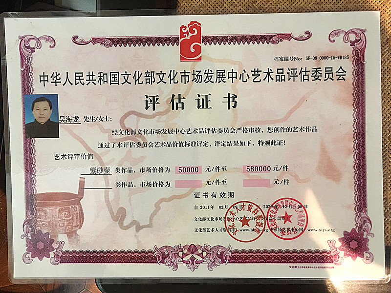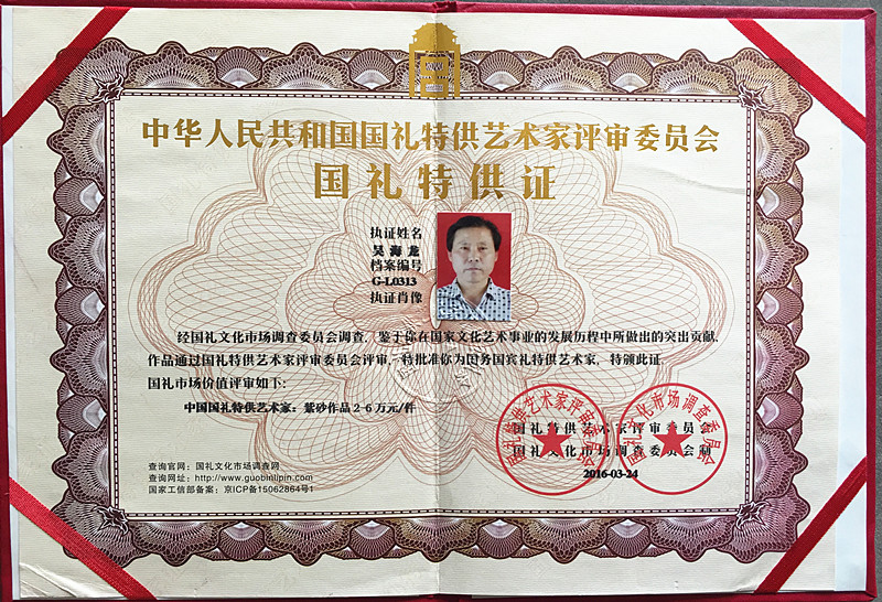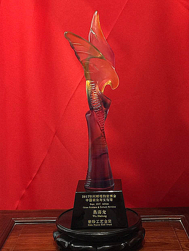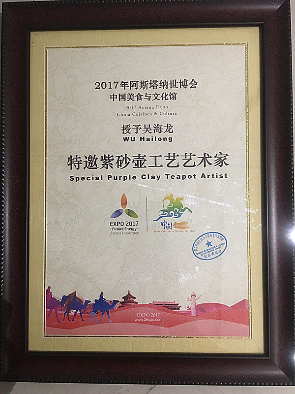 其作品寓意于壶,还魂于砂,严谨而不泥古,典雅也趣于天然。 匠人需数十年方可成就,匠心需数百年传承而来,吴海龙大师,承百年技艺,创新式风格。他的紫砂作品多次荣获海内外国际性及国家级金奖,被人民大会堂、中南海艺术馆、国家博物馆、中国农业博物馆等纷纷收藏,被泰国亲王、英国王子、美国硅谷、海峡两岸等的文化艺术大家们大加赞赏,也因一带一路文化交流被带出国门走向世界,入选2017年哈萨克斯坦世博会,得到来自世界各地艺术学者的认可。