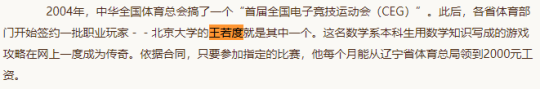 对于老玩家来说,王若度在当年绝对算得上是传奇人物,还在北大上学时,就横扫了各大赛事,甚至连战胜过韩国最顶尖职业选手的super,也曾被他斩于马下。而且还是个学霸,不仅考上了北大研究生,而且后来还去了美国留学当上了副教授。