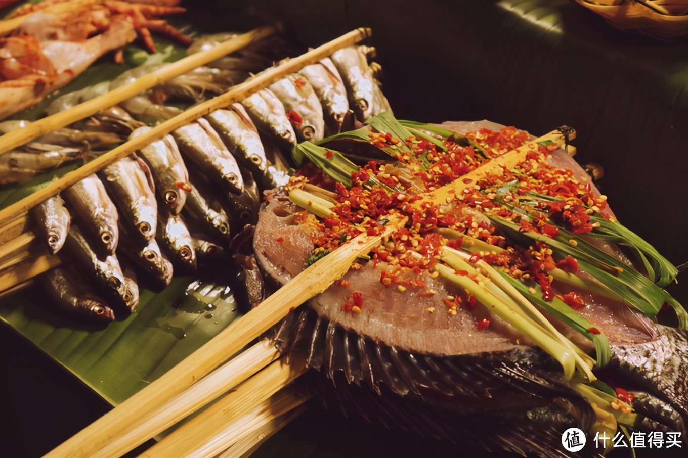 4、我们晚上吃的一家叫“傣庄园-正宗傣味餐厅”,菠萝饭一般般,香茅草烤鱼肉质比较嫩,外焦里嫩还不错。烤鸡很好吃,必点!外酥里嫩,烤的比较干但是不柴,配的辣椒很够味。五花肉刚烤完比较好吃,放久了口感比较q也有点腻,烤五花、烤鸡、烤排骨给的蘸料都是一样的。包烧豆腐无功无过,傣味年糕不喜欢糯米和甜的就不要点了。总的来说味道中规中矩,不惊艳。如果想体验特色的西双版纳小吃,可以去星光夜市觅食。