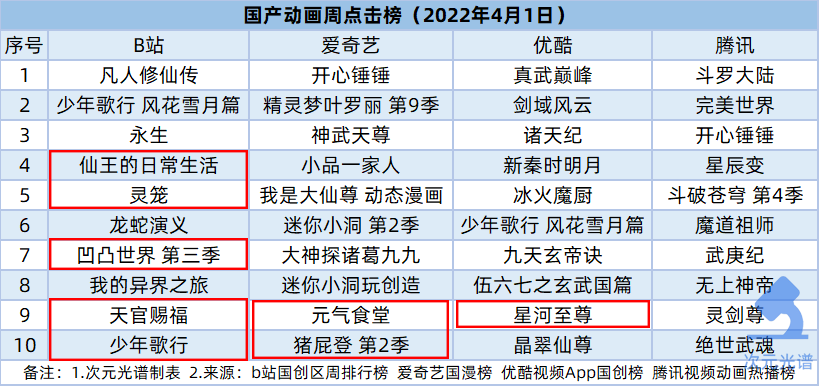 b站国产动画方面,玄幻热血3d动画剧集《凡人修仙传》蝉联榜首,该片由b站、猫片、万维猫动画、原力动画出品,由万维猫动画和原力动画制作。截至4月1日,已连载了43话,累计播放量6.2亿次,追番人数524.5万,b站评分9.7分。
