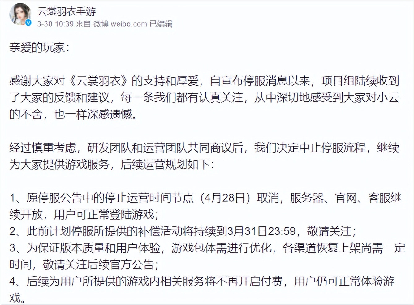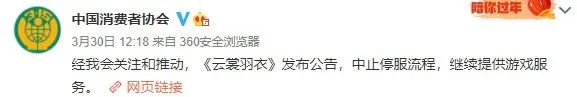 在中消协的关注和推动下,3月30日,《云裳羽衣》宣布决定终止停服流程,继续提供游戏服务。
