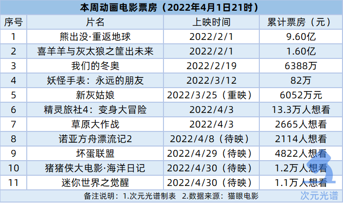 动画电影方面,于2月1日上映的《熊出没·重返地球》,截至4月1日21时累计票房9.60亿,猫眼预测其总票房为9.63亿元。