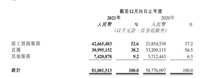 分业务来看,2021年快手的线上营销服务(广告业务)成为第一大收入来源,全年收入同比增长95.2%达426.65亿元,广告商数量同比增长超60%;直播业务收入309.95亿元,同比下降6.6%;其他服务(包括电商)收入74.21亿元,同比增长99.9%,全年电商交易总额(gmv)达6800亿元,同比增长78.4%。