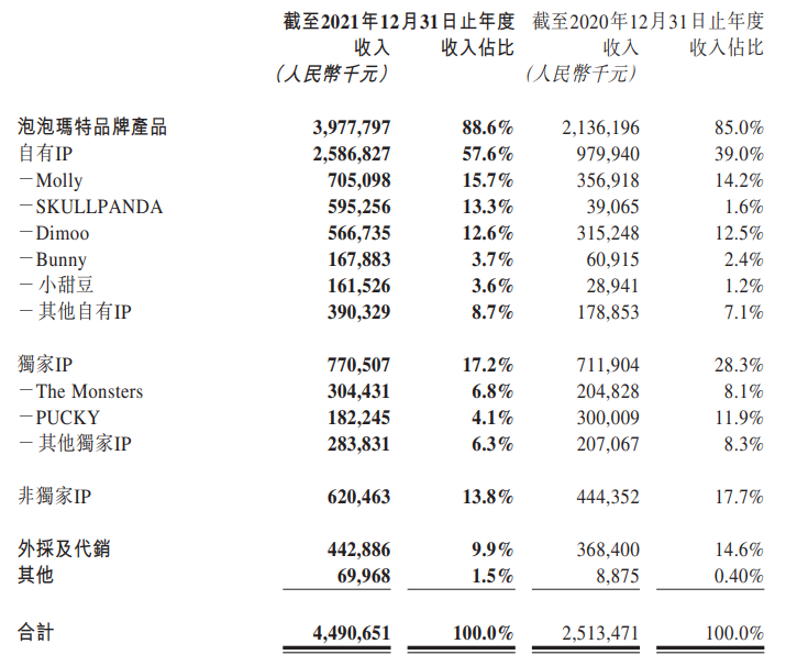 skullpanda、dimoo、the monsters、pucky和bunny,在2021年分别实现收入5.953亿、5.667亿、3.04亿、1.82亿和1.68亿元。(详情回顾:泡泡玛特2021年收入45亿元,利润8.54亿)