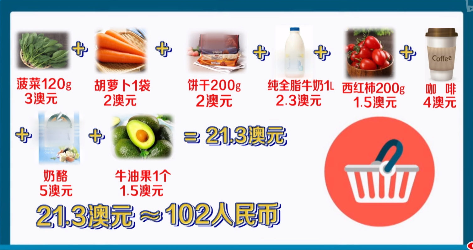 2、澳大利亚:菠菜120g+胡萝卜1袋+全脂牛奶1l+西红柿200g+咖啡+奶酪+牛油果1个