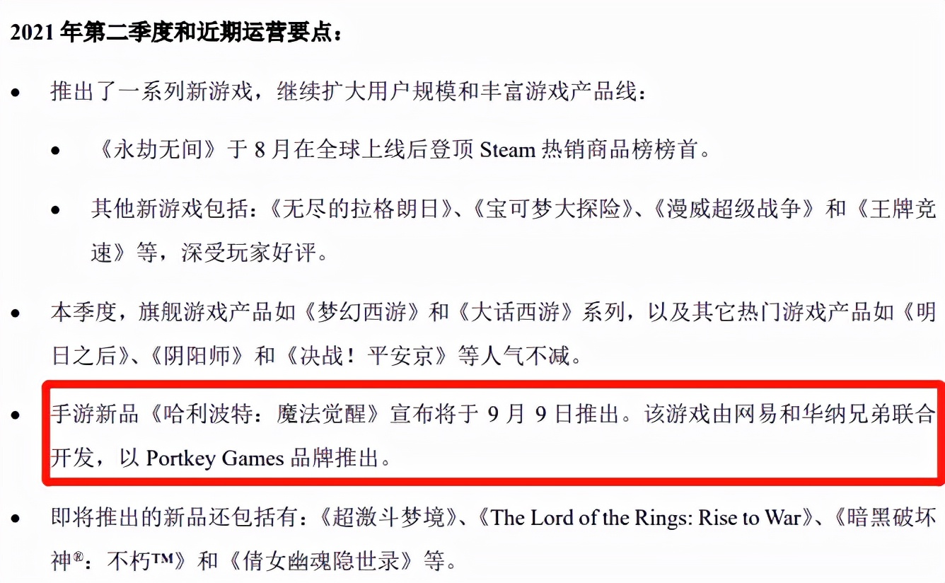 在2021年q2财报中,网易就提到:“手游新品《哈利波特:魔法觉醒》宣布将于9月9日推出,该游戏由网易和华纳兄弟联合开发,以portkey games品牌推出。”而从2019年q4公布这款游戏开始,游戏每一季度的财报中都有提及“我们即将推出《哈利波特:魔法觉醒》”。