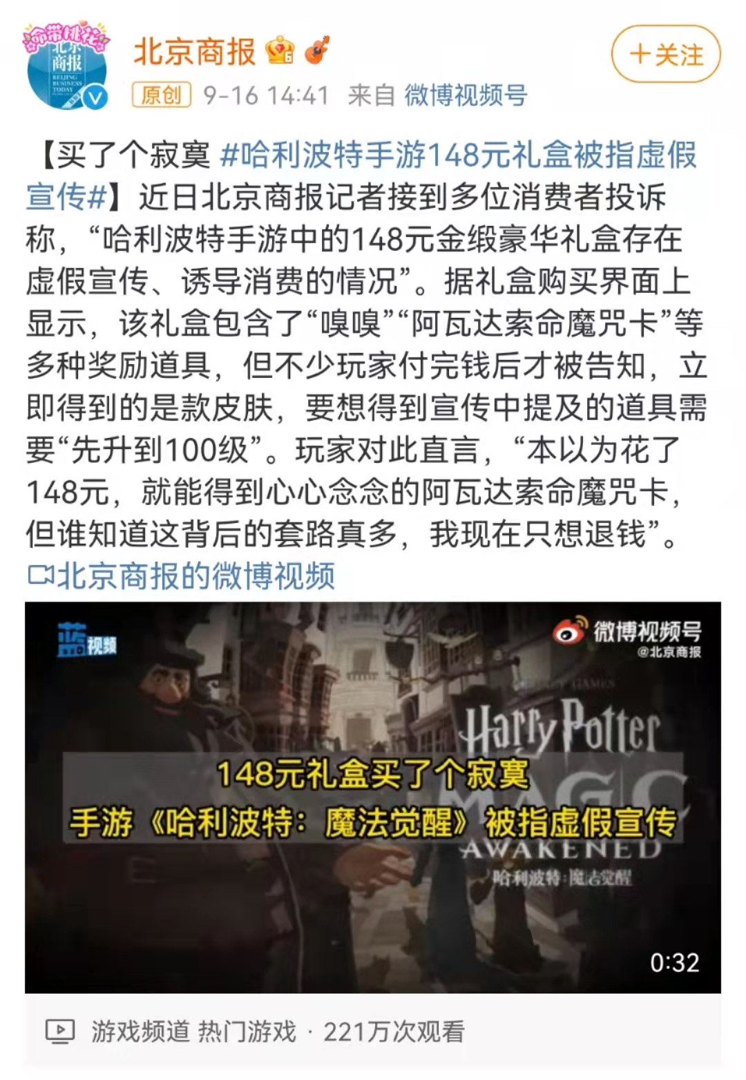 而9月17日,#哈利波特手游148元礼盒被指虚假宣传#飘上热搜,官方事后也回应称“游戏内确实存在表述不清的问题,让玩家误以为可以直接购买到奖励(实际上即便购买也需要完成任务来解锁)”。