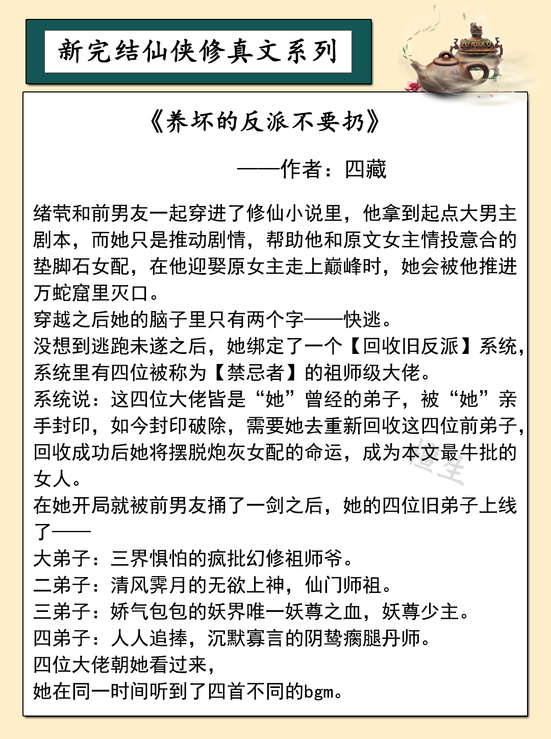 看完感言:这篇文行文欢脱,剧情苏爽,属于沙雕风又超刺激的另类修仙文,女主远离渣男,专注自己的修仙事业,按照系统的指示,开创门派、收集弟子、重振声望、秘境试炼等等,一路开挂飞升。期间和弟子的日常以及渣男的对峙都写得爽点连连,让人倍感舒适。女主门下的四大弟子,也各有各的萌点,大弟子疯批又绿茶,凭着捉摸不透的属性成功拿下女主的欢心。
