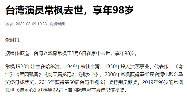 1949年,26岁的常枫前往台湾发展。台湾的第一部电影、第一部电视剧都与他有关,因此他拥有了台湾电影电视“活化石”的称号。