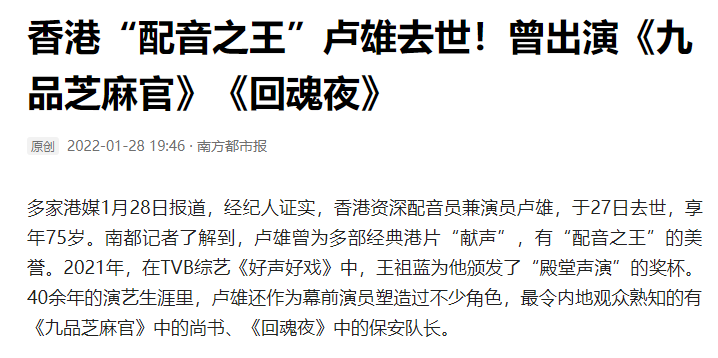 在演艺界,卢雄塑造了众多经典角色,他在《九品芝麻官》中饰演的“尚书大人”,在《回魂夜》中饰演的“保安”,最为年轻人所知。