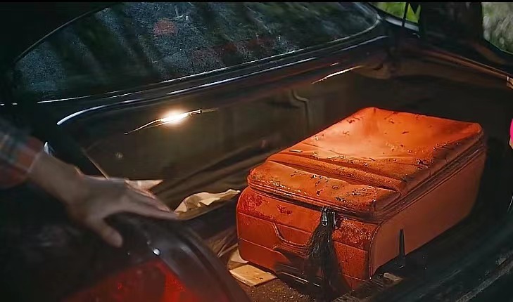 他害怕了,匆忙驾车驶离隧道。驶离隧道后,男人将车停在路边,随后打开了后备箱,里面有一个带血的行李箱,还有一截黑发露在外面。男人拿出小刀,割掉了那截头发。(这里大致能猜到,他刚刚杀害了一个女人,现在应该是要去抛尸)