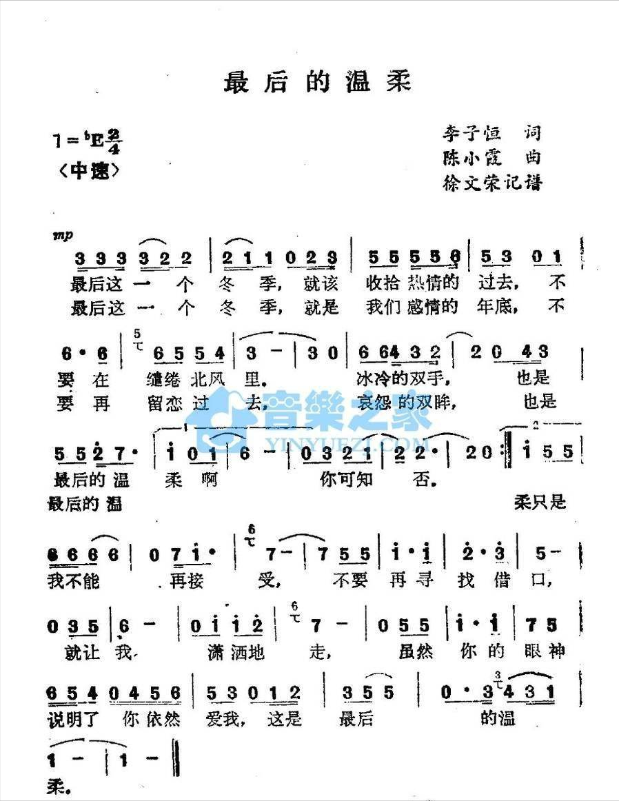 《最后的温柔》这首歌是2/4拍,ab曲式的类型,典型的流行歌曲风格。歌曲的第一段a是钢琴的柱式和弦伴奏3 5 3 5 | 3 3 5 3 | 2 2 5 -,重复的a加入其它乐器。最值得一提的是歌曲的间奏,加入了古典风格的小提琴组演奏,给整个歌曲增色不少,给歌曲带来了典雅的氛围。重复b段几次后,最后渐弱处理(fade out)。