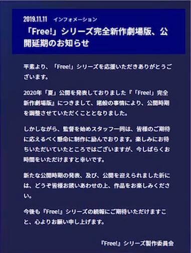 5、free最新剧场版发布延期公告